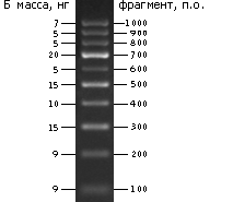 Маркеры длин ДНК — стандарты для определения длины двухцепочечных молекул ДНК с помощью электрофореза в агарозном геле. Маркеры состоят из фрагментов двухцепочечной ДНК строго определенной длины. Маркеры могут быть так же использованы для приблизительной оценки массы фрагмента ДНК в образце путем сравнения интенсивности полосы образца с полосой маркера той же длины. Маркеры поставляются с буфером для нанесения на гель, содержащим красители бромфеноловый синий и ксиленцианол. |