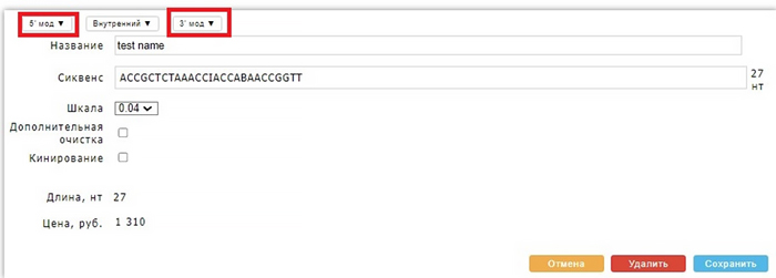 При заказе олигонуклеотидов через онлайн форму, доступны следующие варианты модификации: